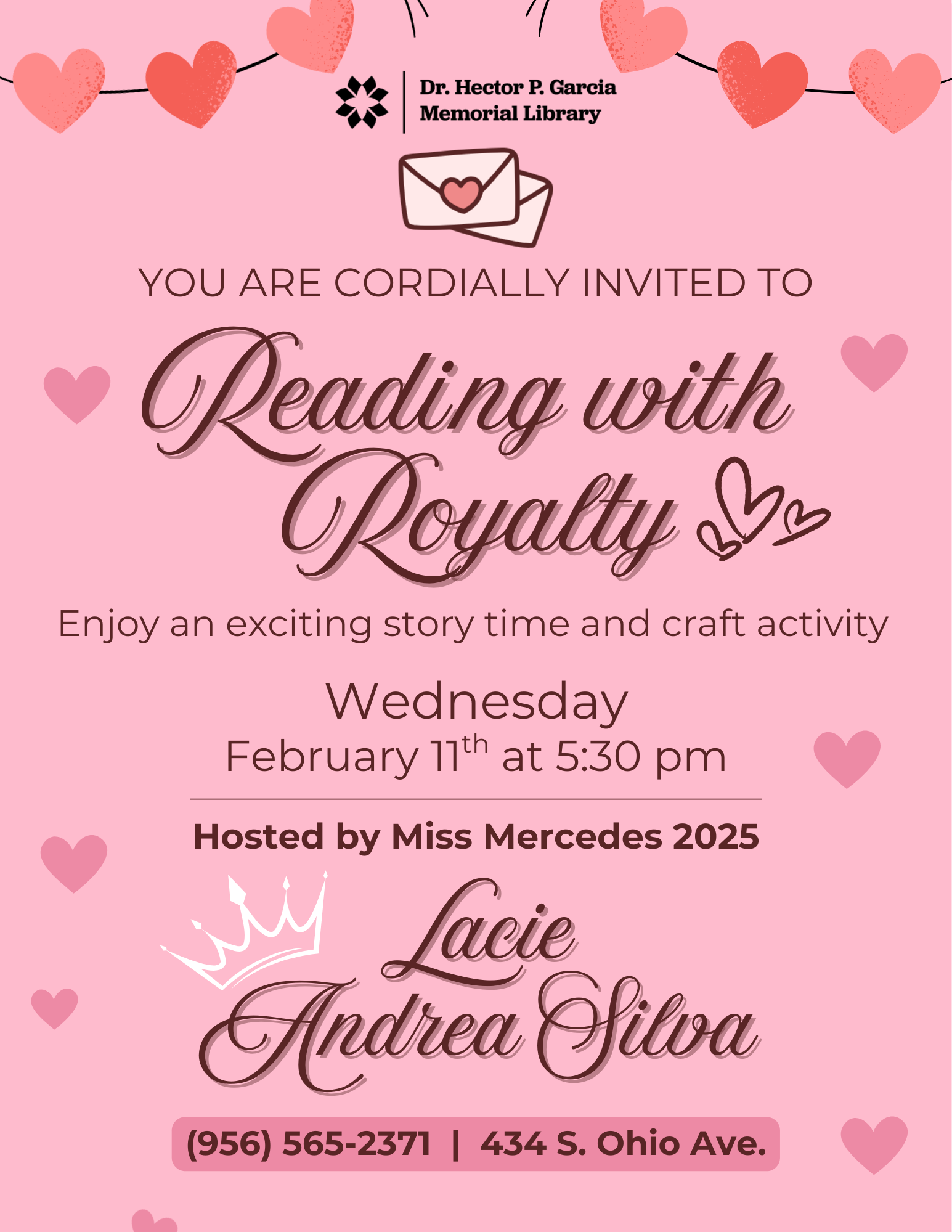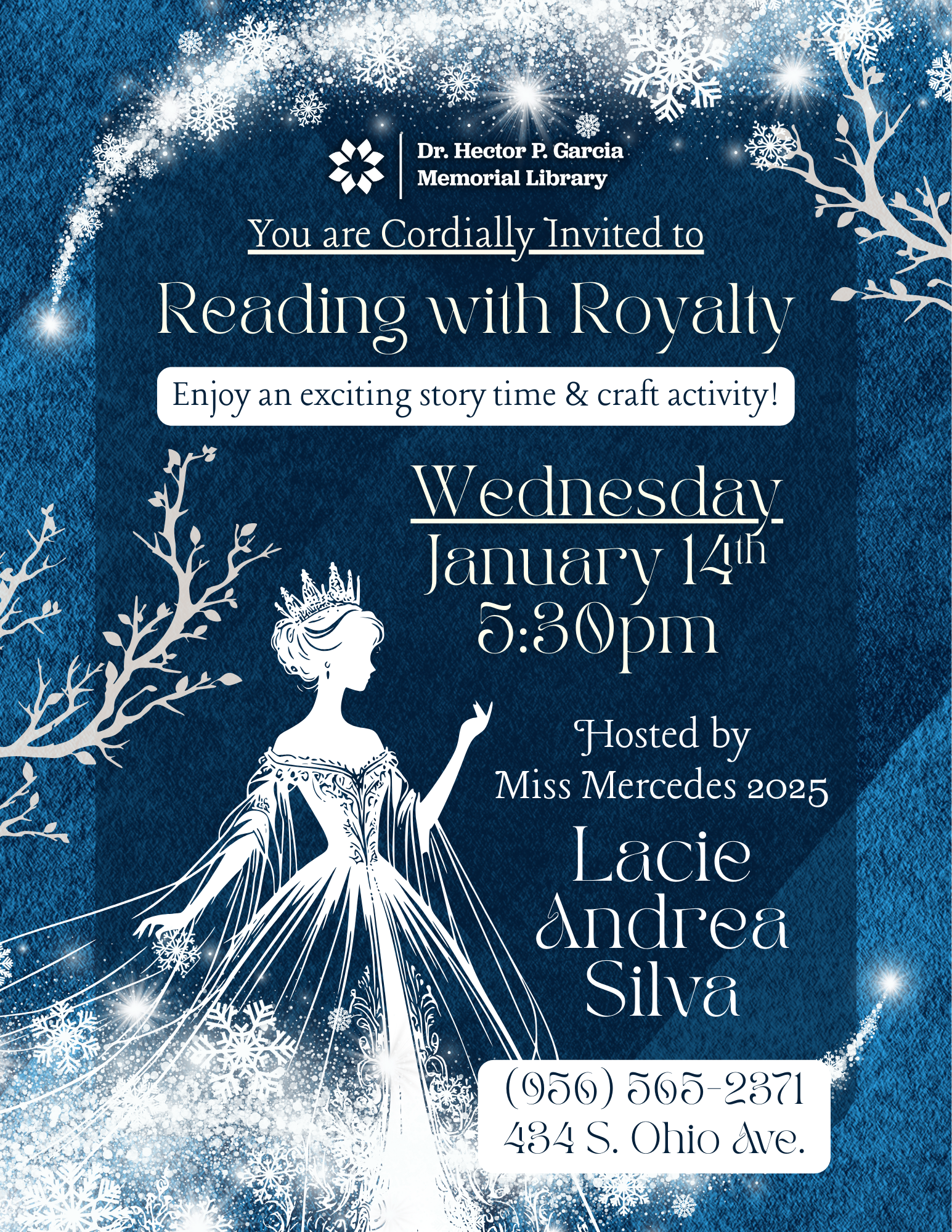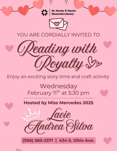 Miss Mercedes 2025, Lacie Andrea Silva visits each month to read to the children. She also does a fun craft or activity with them. Aimed towards children aged 3 to 10.
