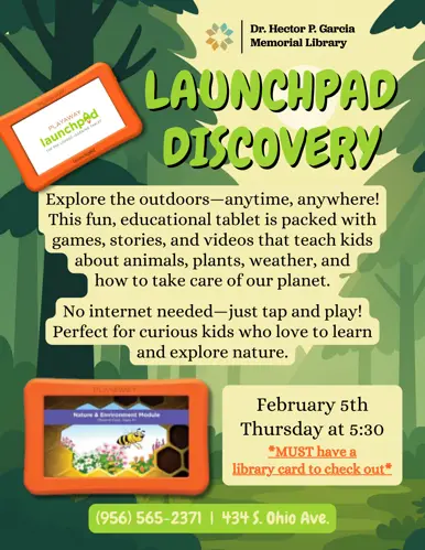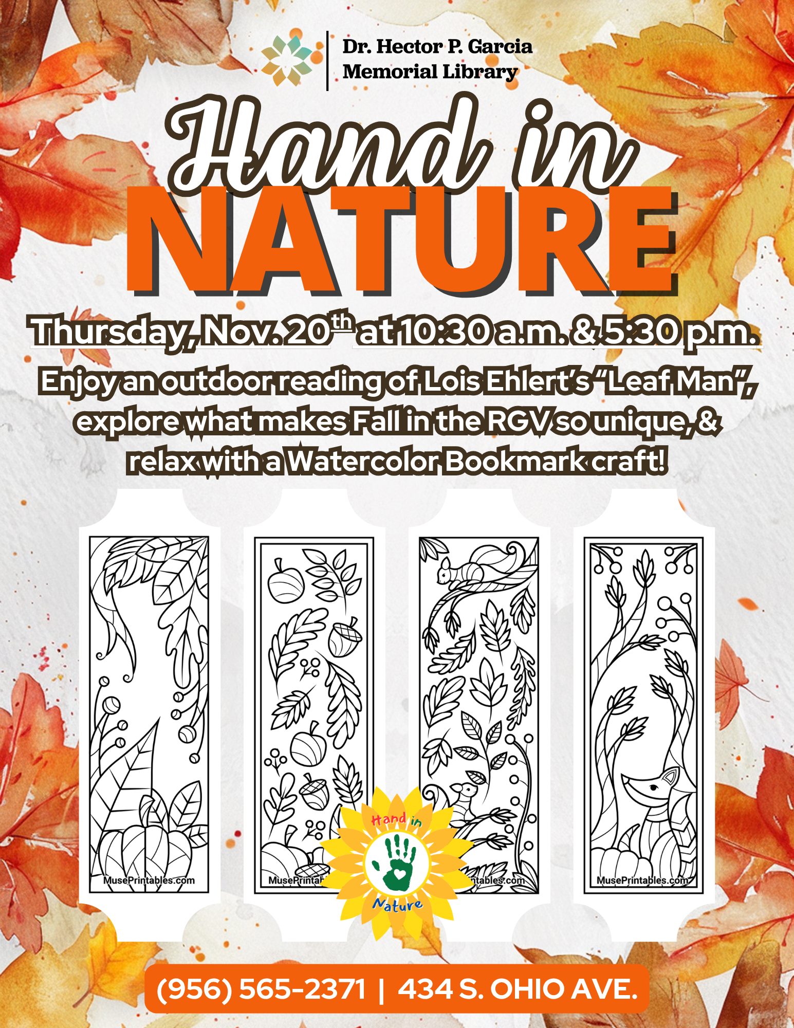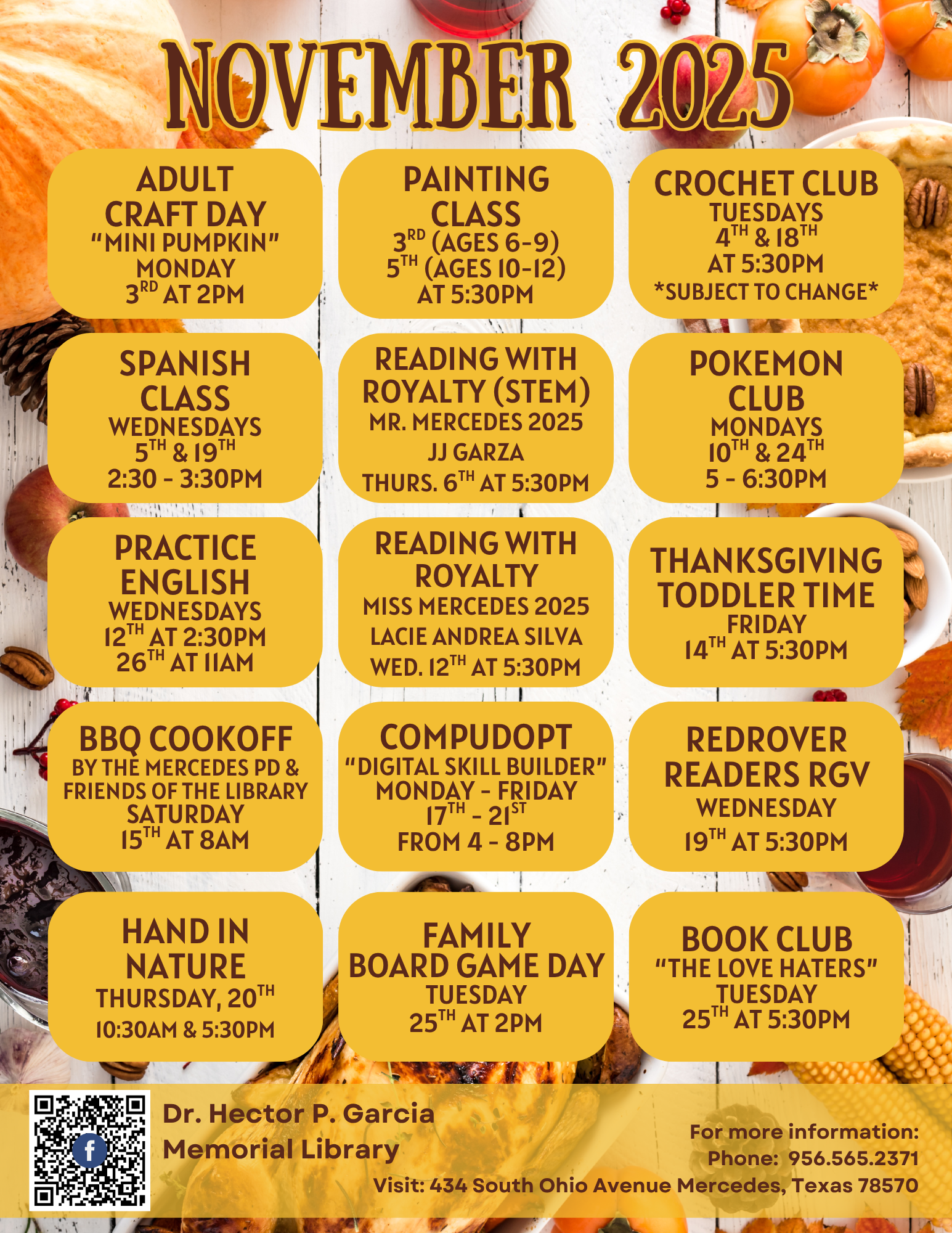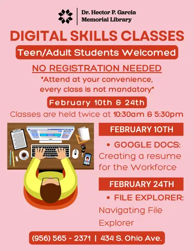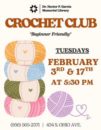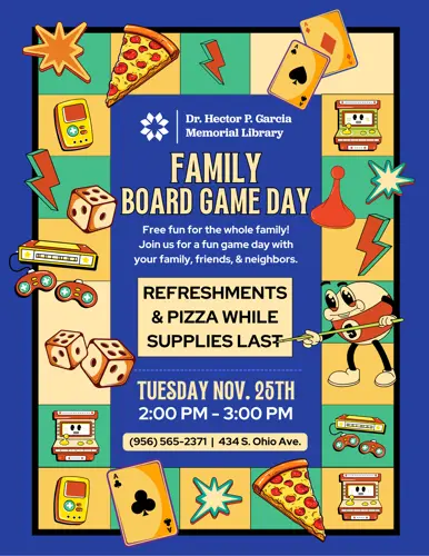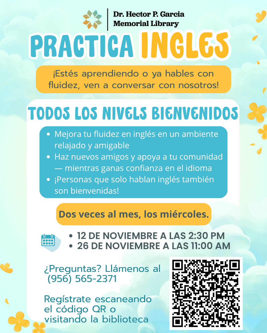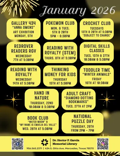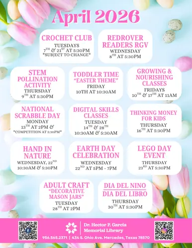 The Dr. Hector P. Garcia Memorial Library has various programs occurring throughout the year for children, teens, and adults. Below you can find a list of our regular programming, but make sure to check on the flyer for specific dates and times.
