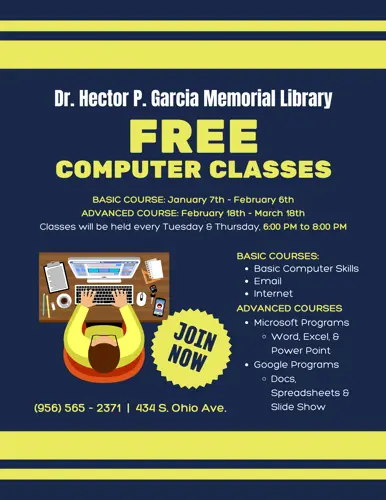 The Dr. Hector P. Garcia Memorial Library has various programs occurring throughout the year for children, teens, and adults. Below you can find a list of our regular programming, but make sure to check on the Event Calendars for exact date and times.