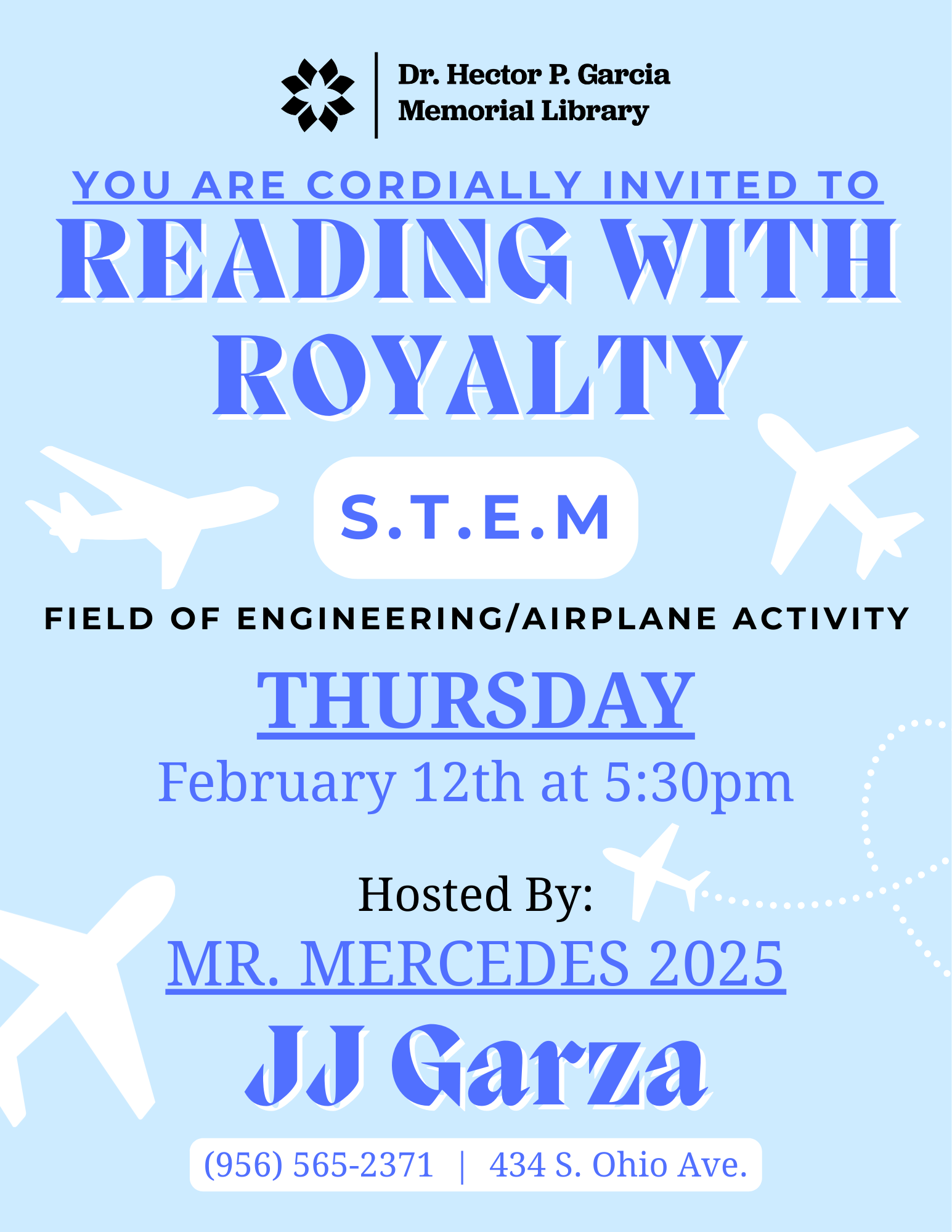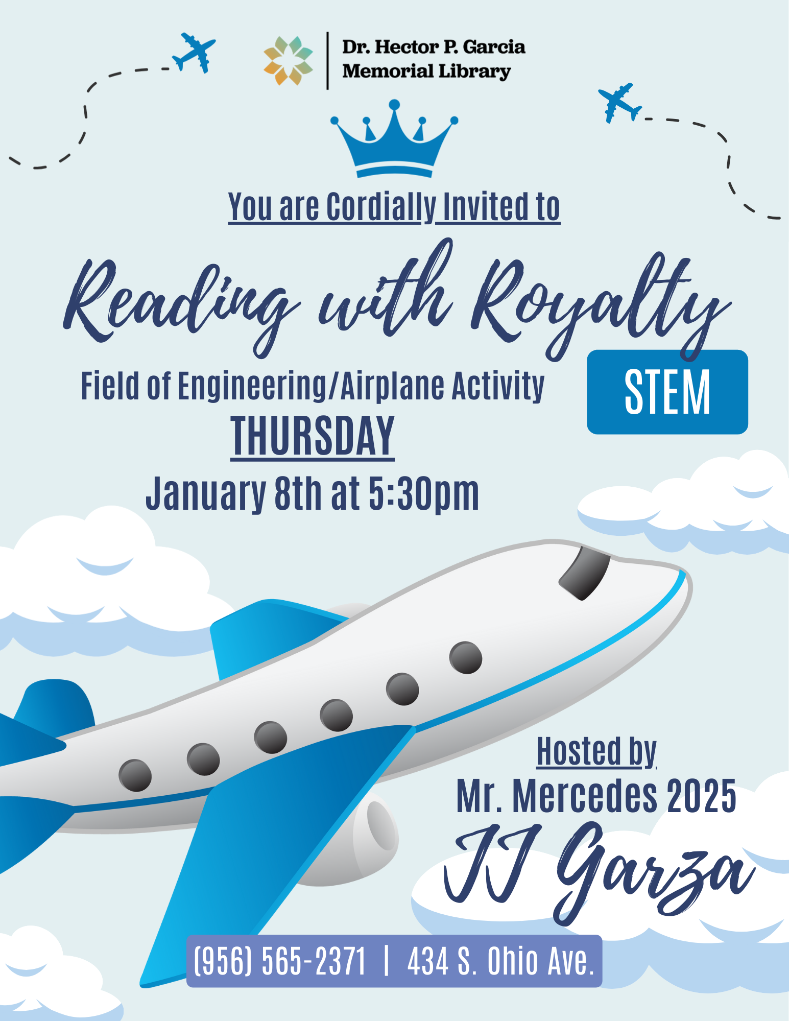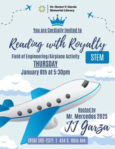 Mr. Mercedes 2025, JJ Garza, visits the library every month to do STEM activities with the children. Aimed towards children aged 5 to 15.
