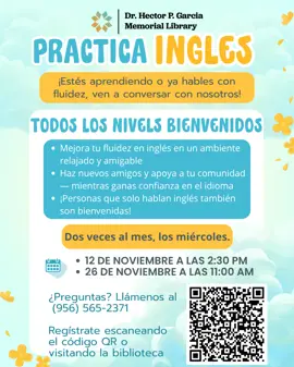 Learn how to communicate confidently in English with everyday topics. Classes are twice a week on Wednesdays at 2:30 PM.