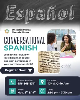 Learn how to communicate in Spanish with easy activities. Classes are twice a week on Wednesdays at 2:30 PM.