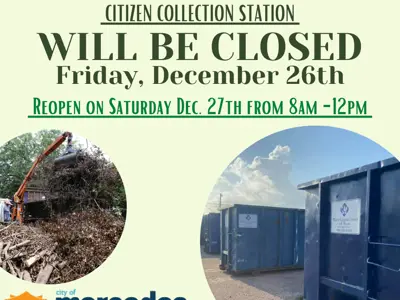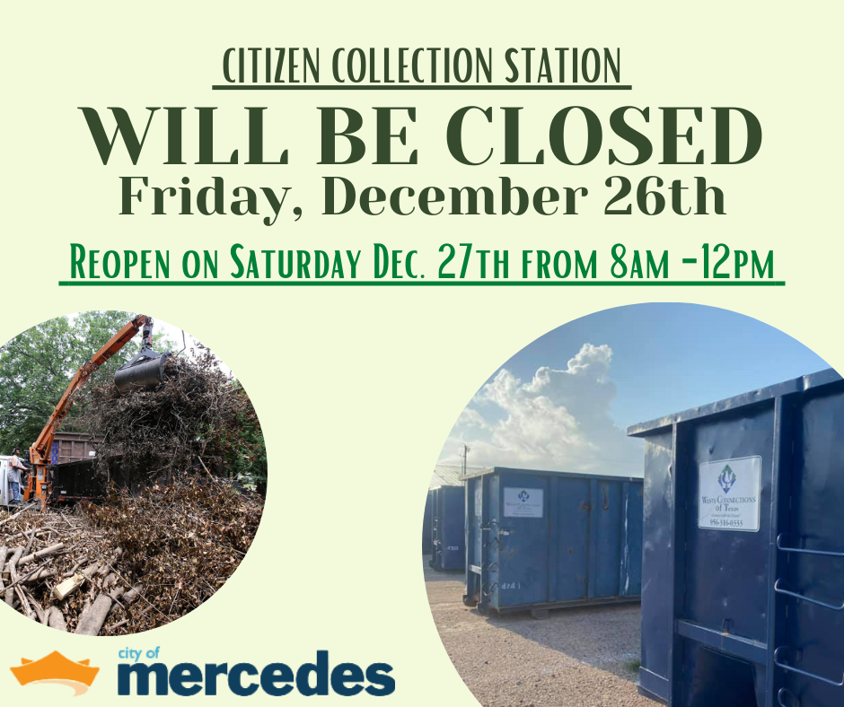 Due to the Holidays, Mercedes Citizen Collection Station will be closed on Friday, December 26th.