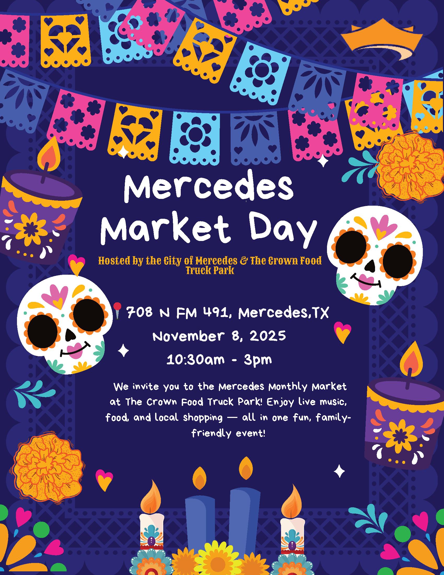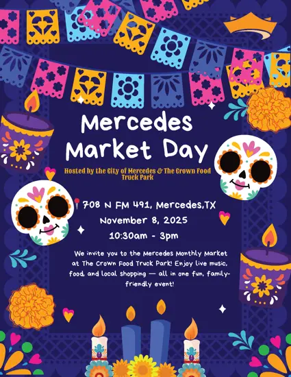 We invite you to the Mercedes Monthly Market at The Crown Food Truck Park! Enjoy live music, food, and local shopping -- all in one fun, family-friendly event!